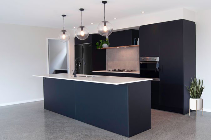 The monochrome palette beautifully ties the exterior to the interior in this minimalist design. The exterior is simple but smart with a clever mix of silver brick and black stained ShadowClad, flowing through to a modern interior of polished concrete, matt black finishes and pops of timber.